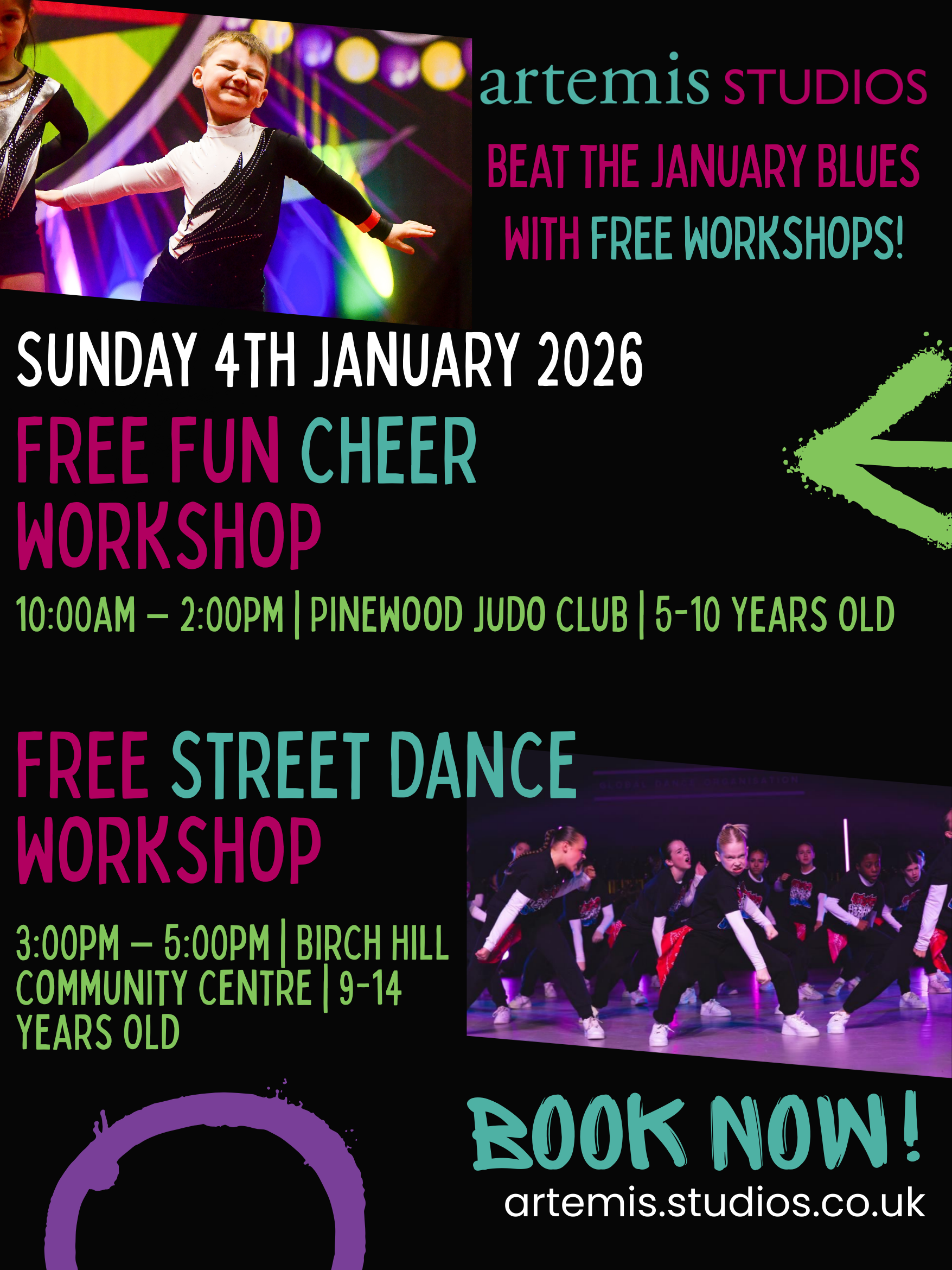 FREE holiday workshops for children! Artemis Studios would like to invite you beat the January blues with free dance and cheerleading workshops this holiday.